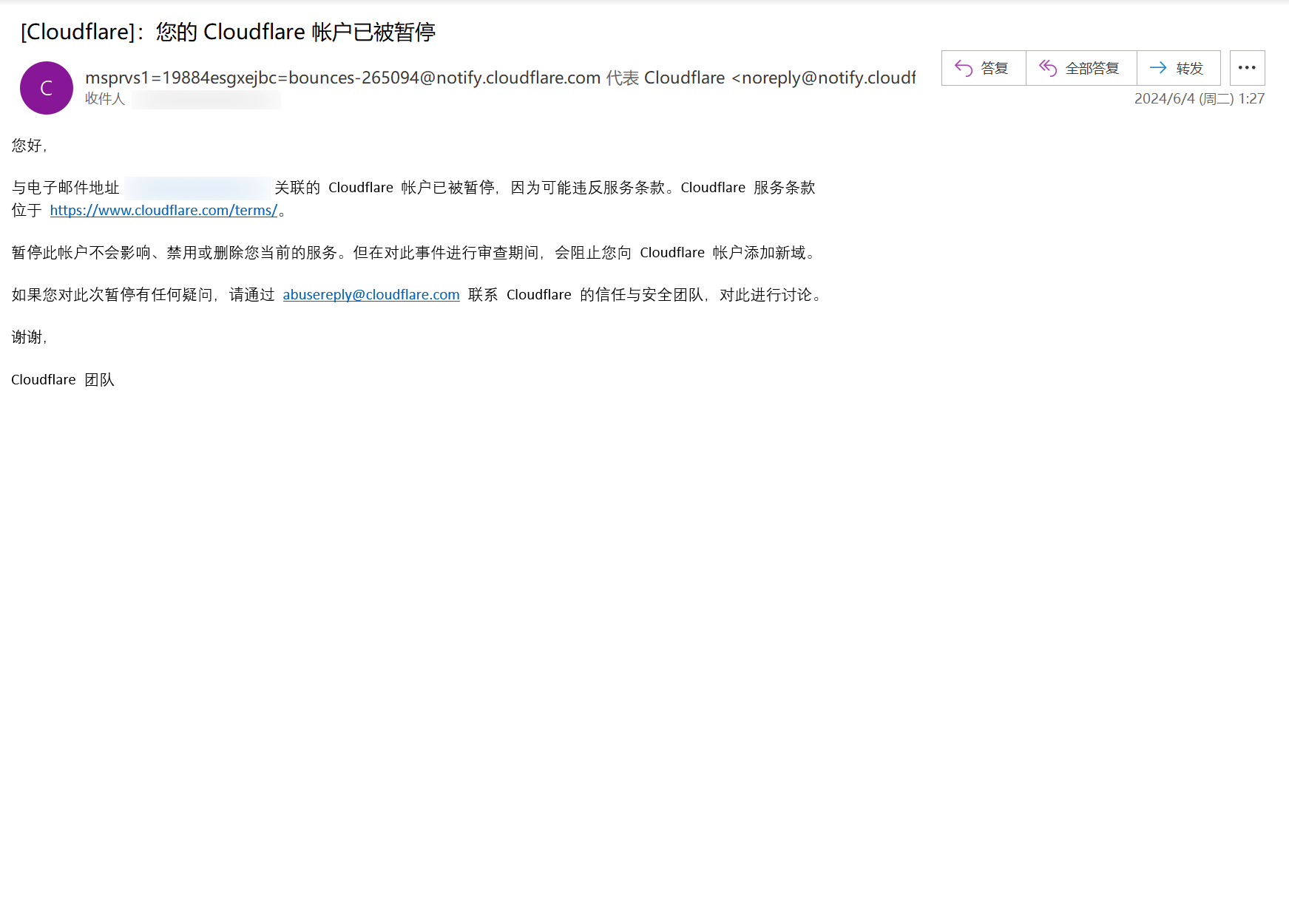 该账户违反了 Cloudflare 的服务条款。特别是网络钓鱼。
