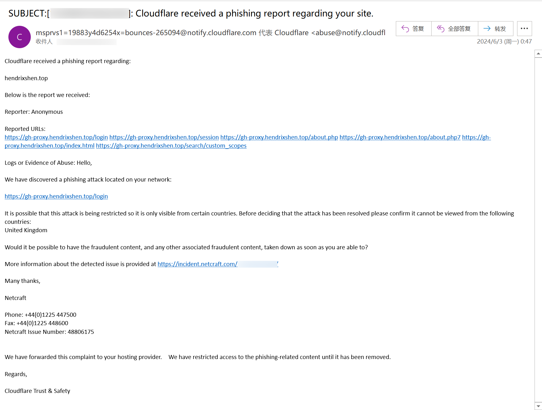 大致是在说:CloudFlare 接到了来自 netcraft 的报告,匿名报告者称下述路径涉嫌钓鱼网站