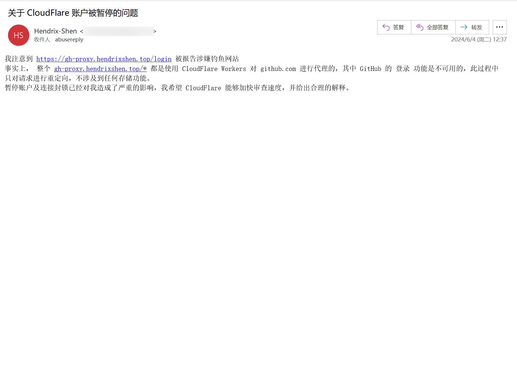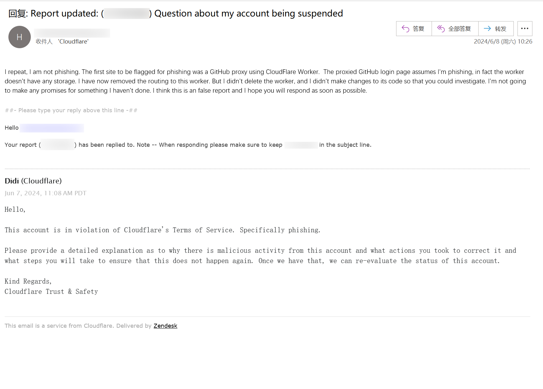 我再说一遍,我没有进行网络钓鱼。第一个被标记为网络钓鱼的网站是使用 CloudFlare Worker 的 GitHub 代理。代理的 GitHub 登录页面假定我在进行网络钓鱼,但事实上该 Worker 没有任何存储空间。我现在已经删除了指向该 Worker 的路由。但我并没有删除 Worker,也没有修改它的代码以便你们进行调查。我不会为我没做过的事情做任何承诺。我认为这是一份虚假报告,希望你们能尽快做出回应。