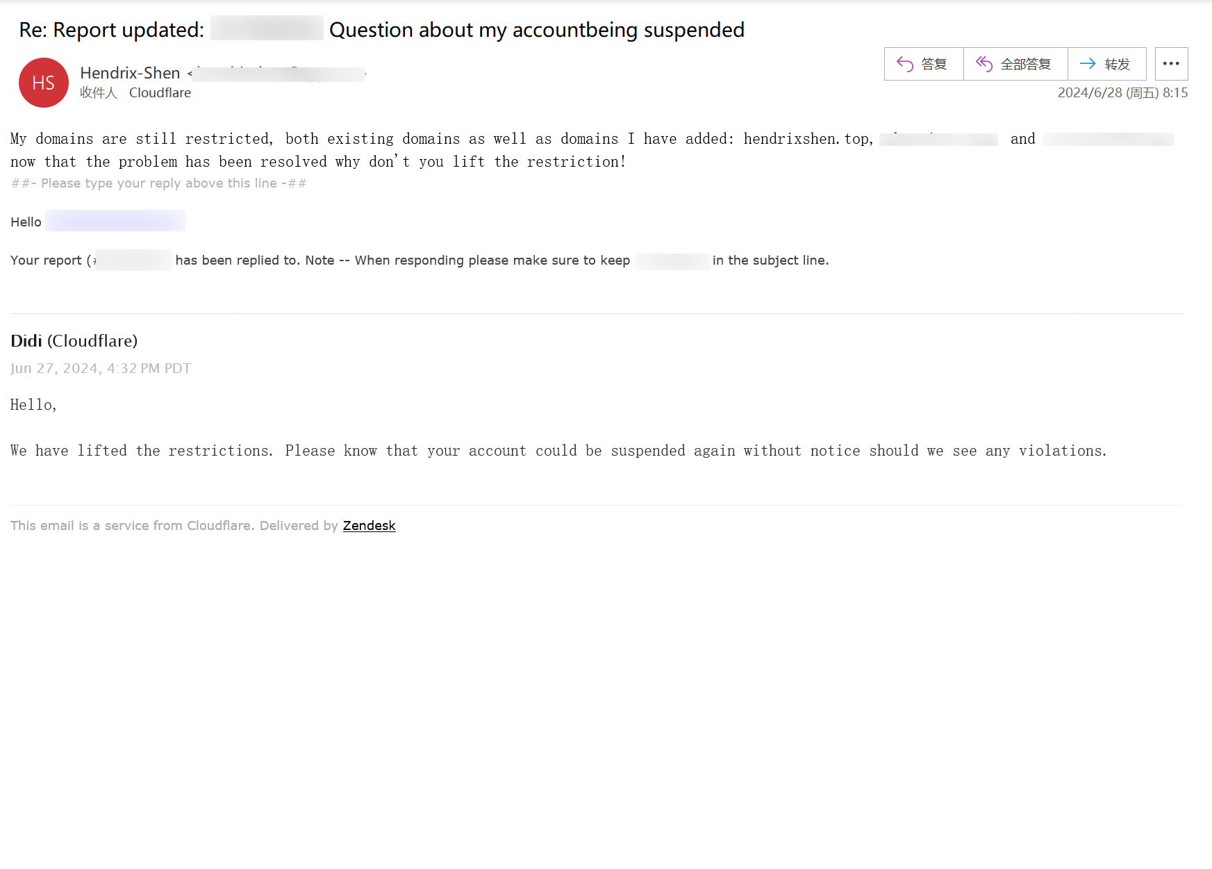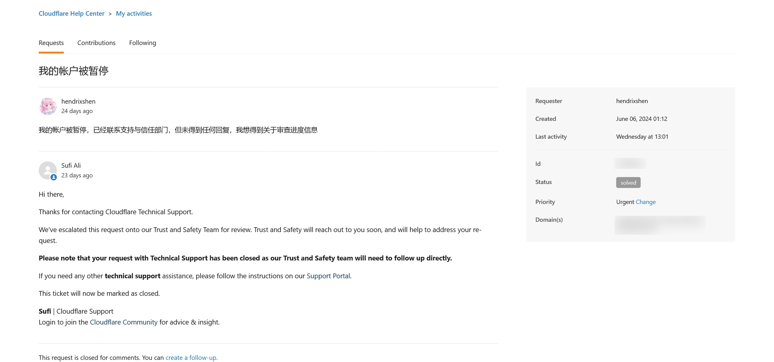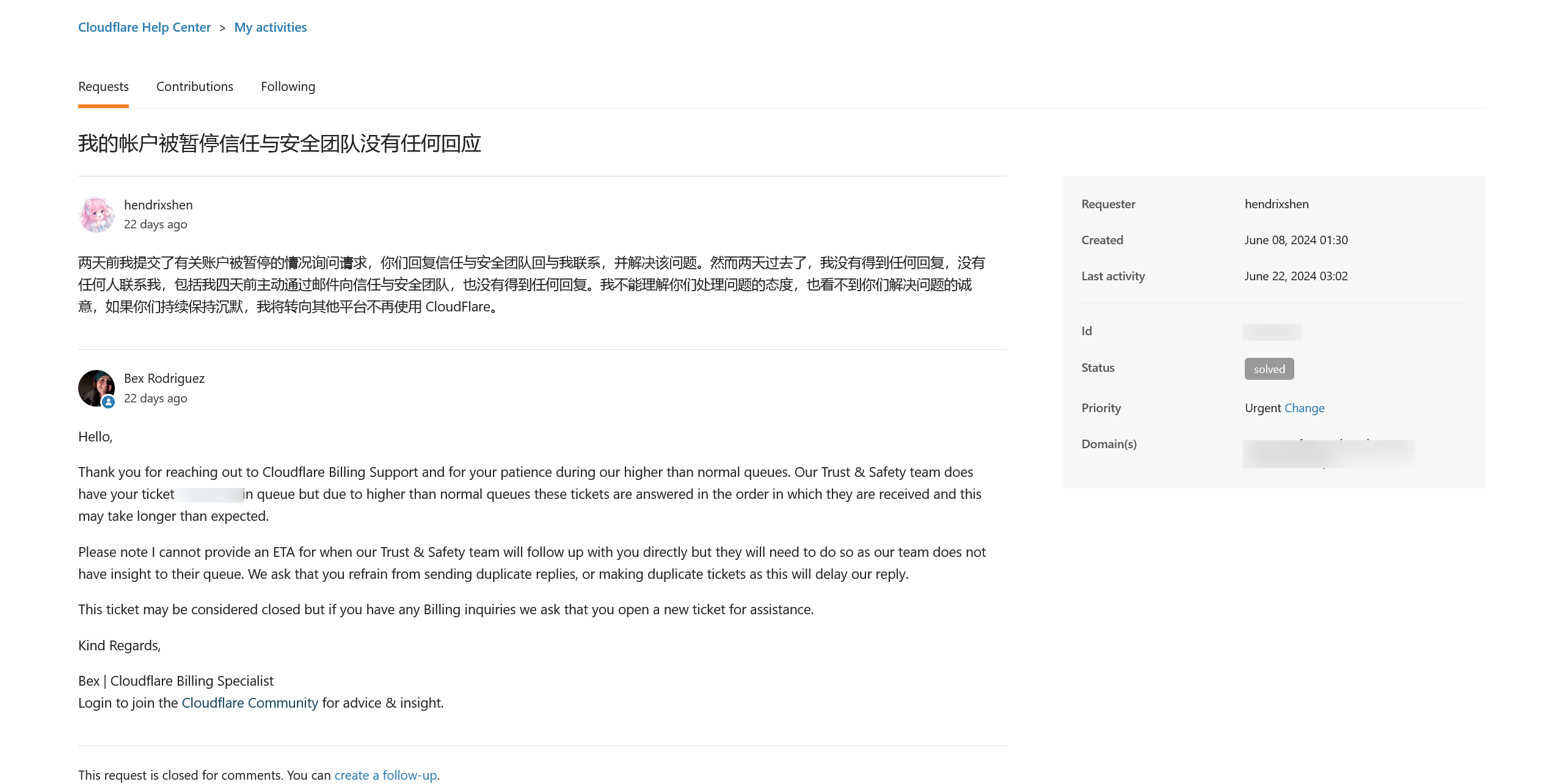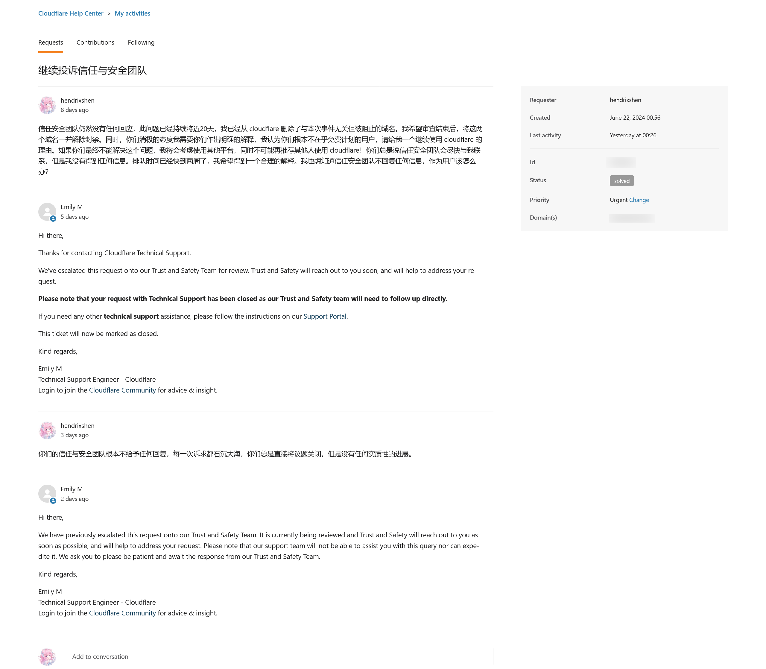 信任安全团队仍然没有任何回应,此问题已经持续将近20天,我已经从 cloudflare 删除了与本次事件无关但被阻止的域名。我希望审查结束后,将这两个域名一并解除封禁。同时,你们消极的态度我需要你们作出明确的解释,我认为你们根本不在乎免费计划的用户,请给我一个继续使用 cloudflare 的理由。如果你们最终不能解决这个问题,我将会考虑使用其他平台,同时不可能再推荐其他人使用 cloudflare!你们总是说信任安全团队会尽快与我联系,但是我没有得到任何信息。排队时间已经快到两周了,我希望得到一个合理的解释。我也想知道信任安全团队不回复任何信息,作为用户该怎么办?