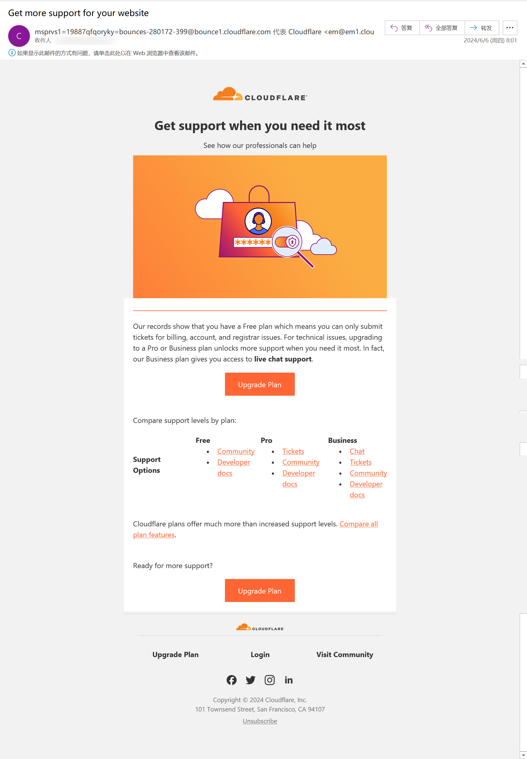 从 2024 年 6 月 3 日 0 时 47 分开始,陆续收到了来自 CloudFlare 的邮件。看起来是这样的: