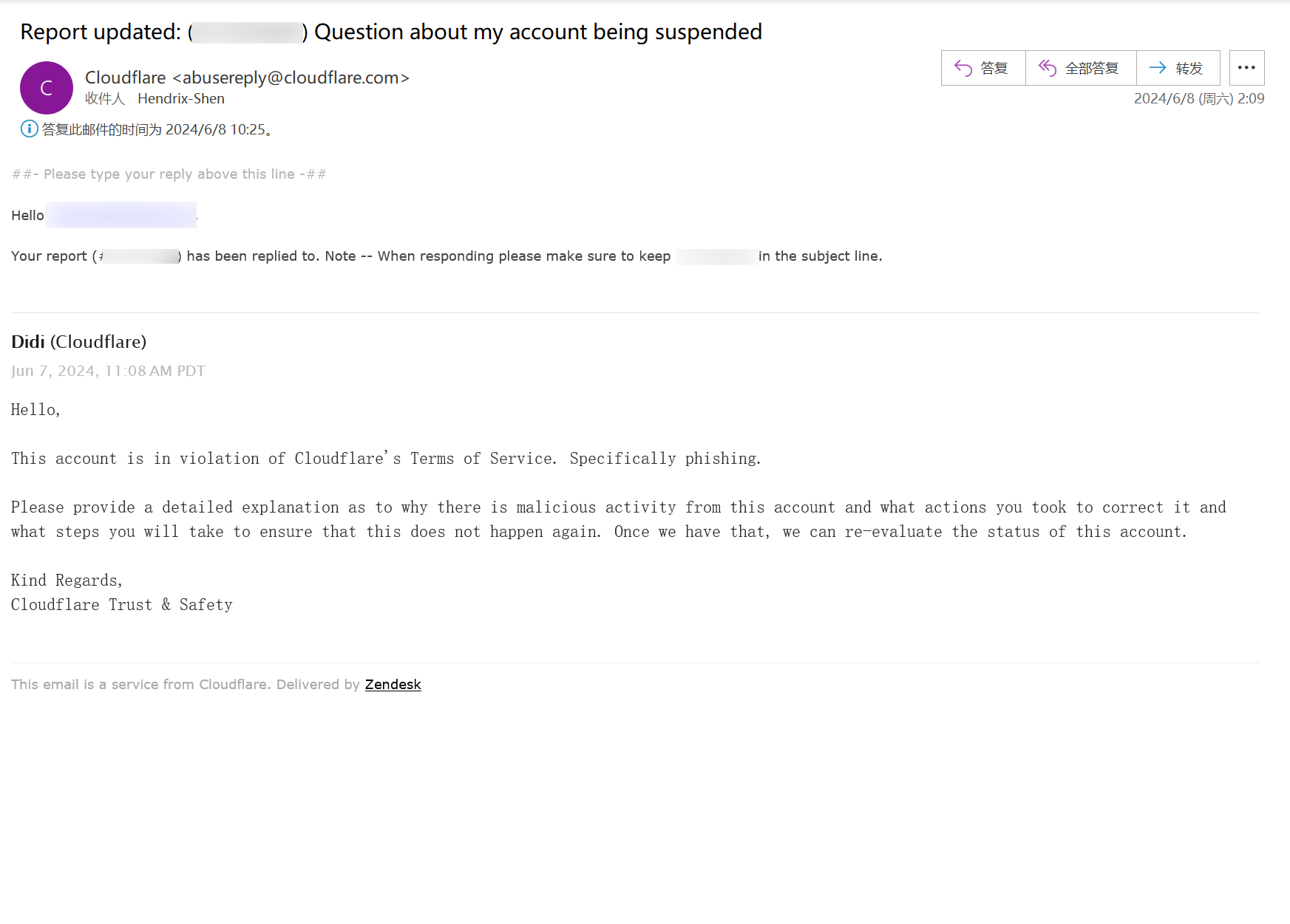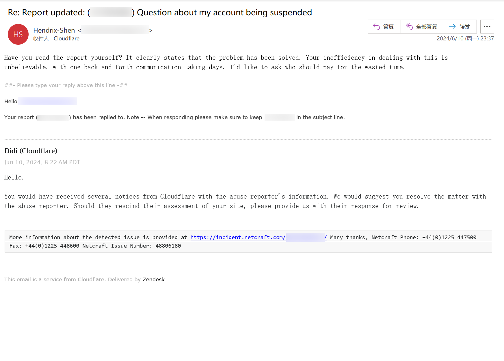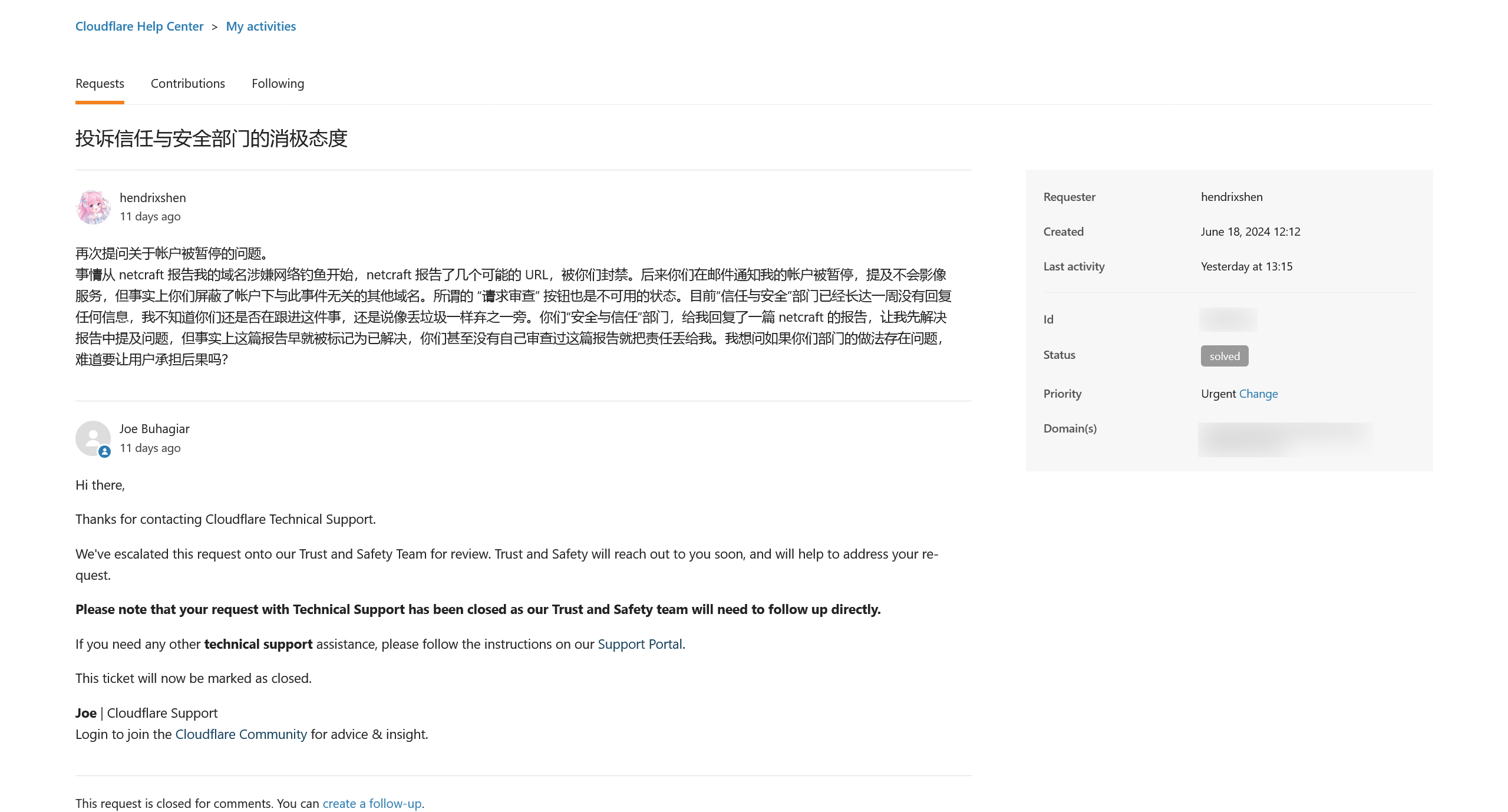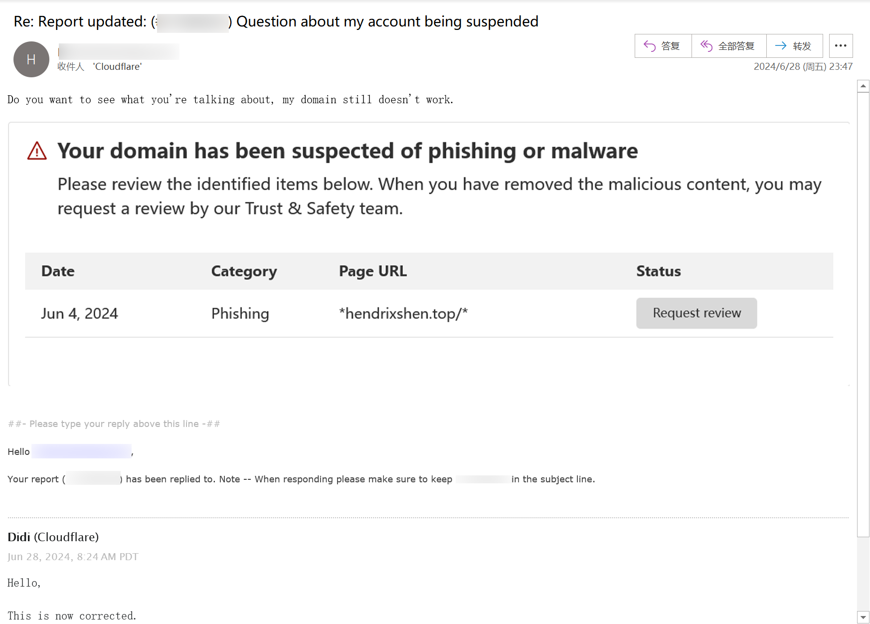 事情从 netcraft 报告我的域名涉嫌网络钓鱼开始,netcraft 报告了几个可能的 URL,被你们封禁。后来你们在邮件通知我的帐户被暂停,提及不会影像服务,但事实上你们屏蔽了帐户下与此事件无关的其他域名。所谓的 “请求审查” 按钮也是不可用的状态。目前“信任与安全”部门已经长达一周没有回复任何信息,我不知道你们还是否在跟进这件事,还是说像丢垃圾一样弃之一旁。你们“安全与信任”部门,给我回复了一篇 netcraft 的报告,让我先解决报告中提及问题,但事实上这篇报告早就被标记为已解决,你们甚至没有自己审查过这篇报告就把责任丢给我。我想问如果你们部门的做法存在问题,难道要让用户承担后果吗?