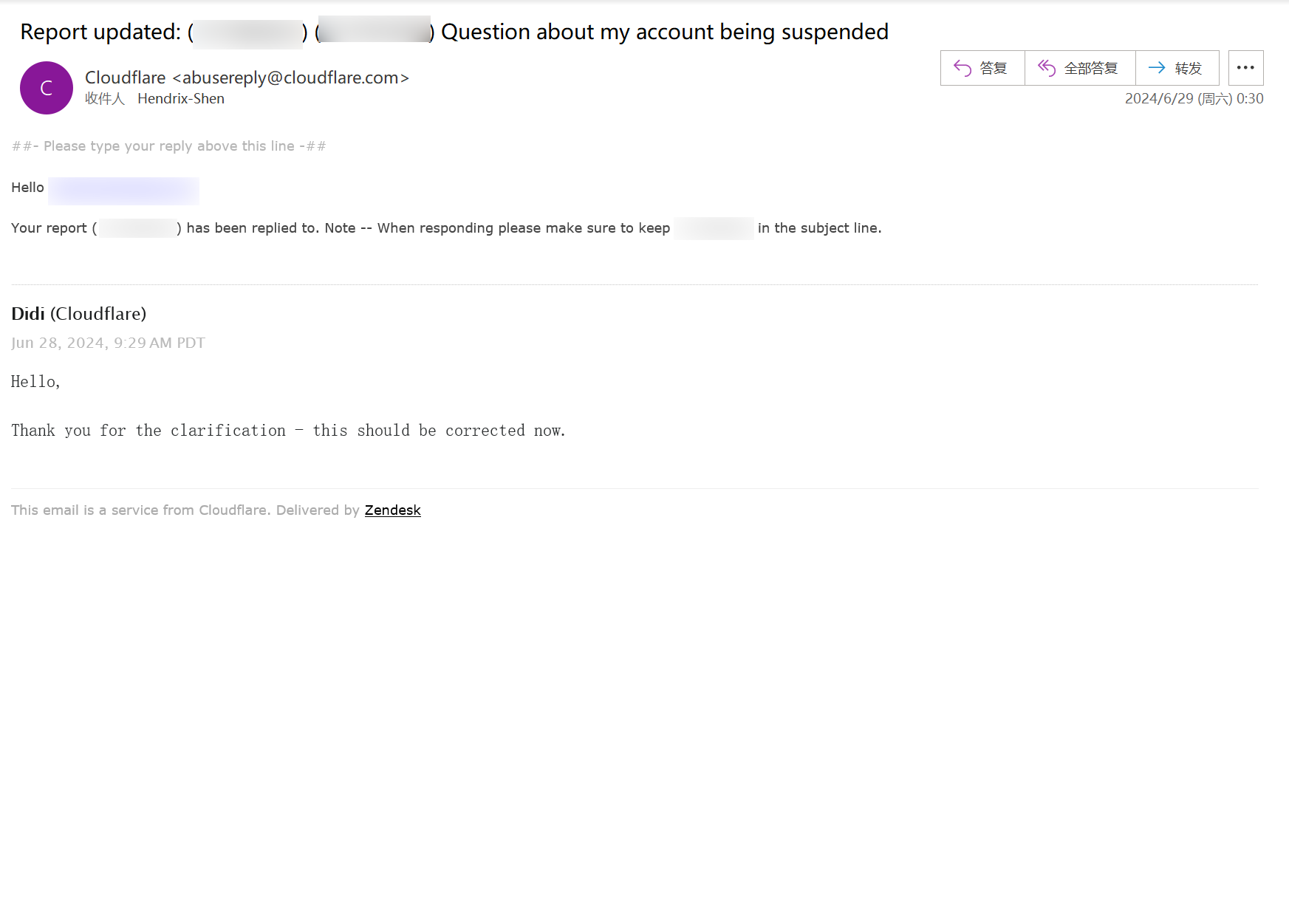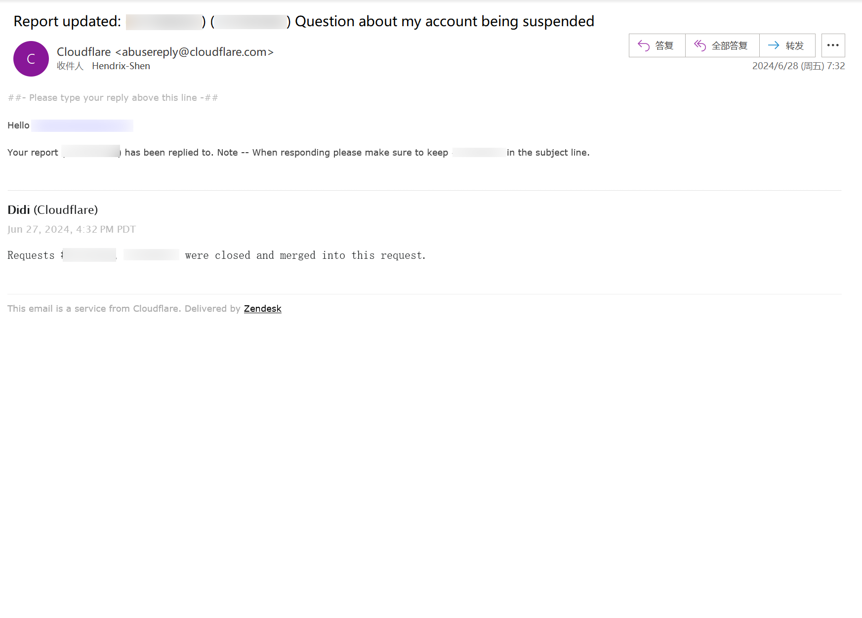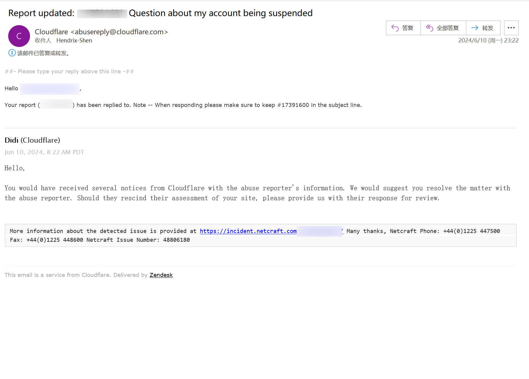 您可能已经收到了来自 Cloudflare 的多份通知,其中包含滥用报告人的信息。我们建议您与滥用报告者解决此事。如果他们撤销了对您网站的评估,请向我们提供他们的回复以供审查。