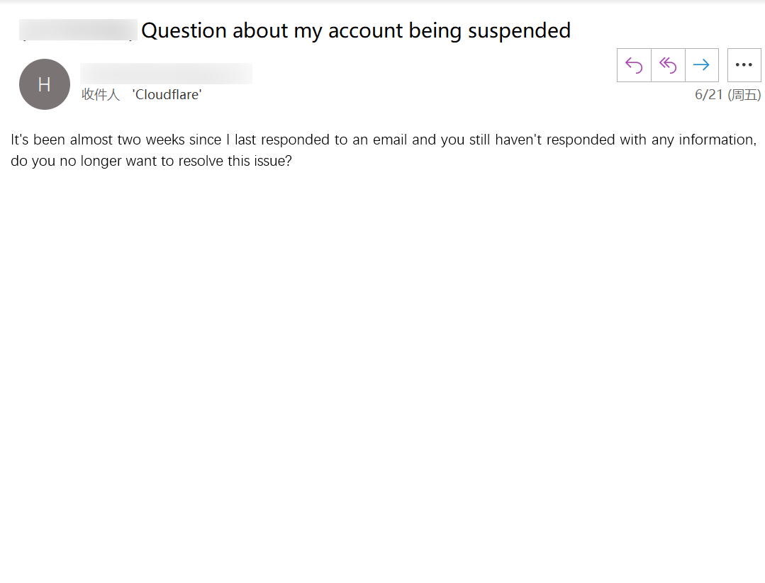 两天前我提交了有关帐户被暂停的情况询问请求,你们回复信任与安全团队会与我联系,并解决该问题。然而两天过去了,我没有得到任何回复,没有任何人联系我,包括我四天前主动通过邮件向信任与安全团队,也没有得到任何回复。我不能理解你们处理问题的态度,也看不到你们解决问题的诚意,如果你们持续保持沉默,我将转向其它平台不再使用 CloudFlare。