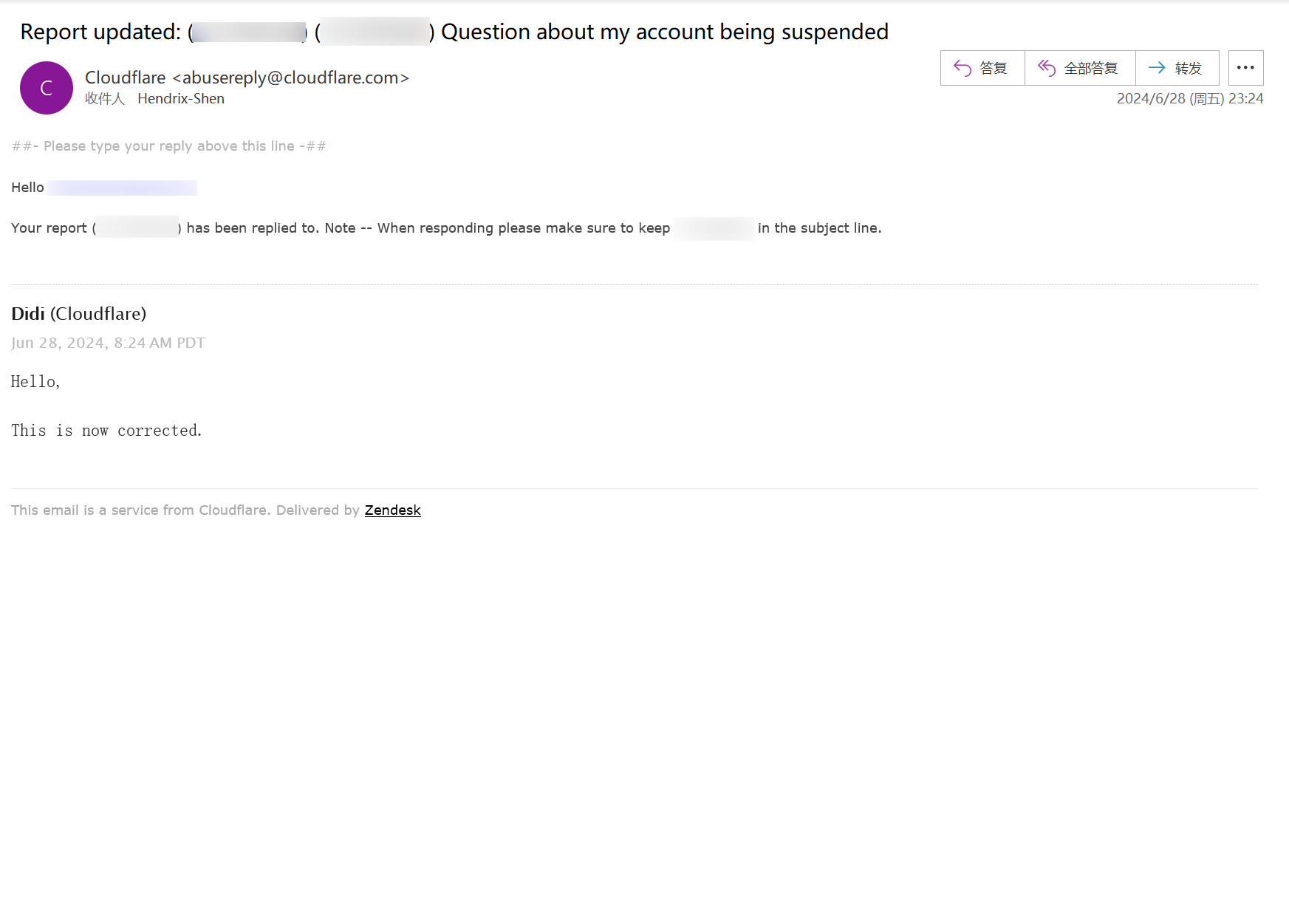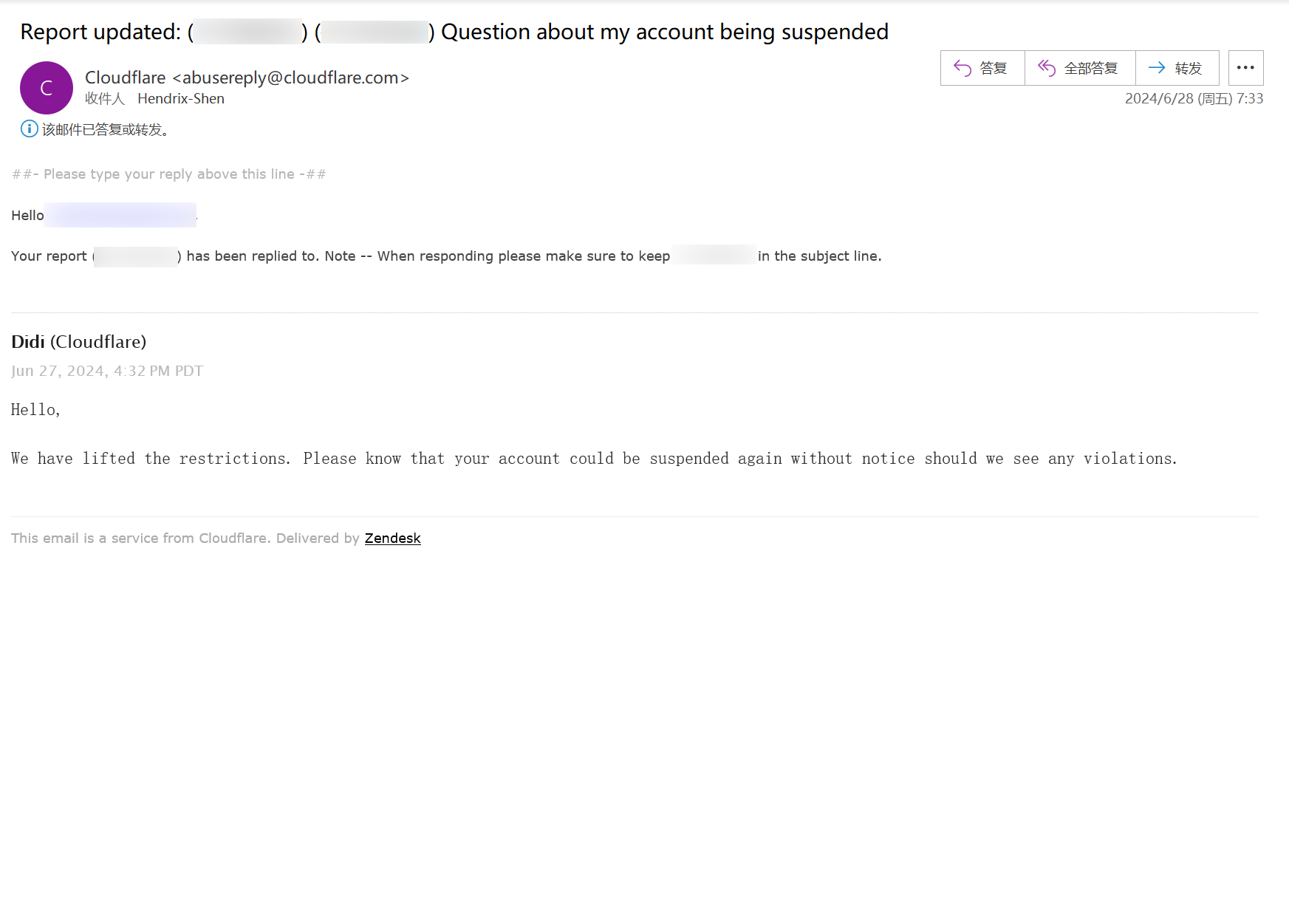 暂停账户及链接封锁已经对我造成了严重的影响,我希望 CloudFlare 能够加快审查速度,并给出合理的解释。